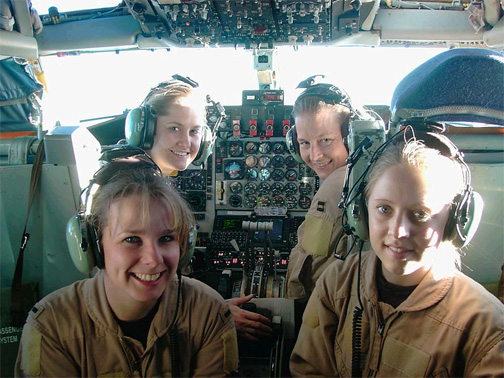 The event marked the first all-female crew to fly an air refueling Mission into Afghanistan from Ganci. "We've been really lucky," said 1stLt Alison, the navigator on board. "You don't always deploy with a lot of women. The fact that we have four women on this deployment, and the fact that we make up a crew is amazing." After living with each other in the same tent for almost two months, the women were eager to fly on the same mission. "We've gotten along really well living together, so we were very excited to finally be able to fly together," said Capt Waynetta, one of the two pilots on the mission. The women, including the other pilot, Capt Heather, and the boom operator, Senior Airman Lyndi, are all assigned to the 99th Air Refueling Squadron at Robins Air Force Base, Ga. They have been deployed here since Dec 9. Once inside the tanker, the women began their pre-flight and take-off duties with an ease borne of plenty of experience and skill. Most of them have deployed before, to places like Saudi Arabia, Qatar, Iceland and Thailand. Between the four of them, they total almost 4,000 flying hours in the KC-135. The flight path to Afghanistan traversed three of the "Stans." The country itself remains a dangerous place. Just a few days before the historic flight, coalition forces on the ground encountered the heaviest fighting since Operation Anaconda last year. Norwegian F-16s from Ganci dropped munitions in support from the air. Once over Afghanistan, the crew got down to business, refueling F-16s from the European participating air forces of Denmark, the Netherlands and Norway. Based at Ganci, the aircraft provide combat air support to coalition ground forces. In the refueling world, the motto is, "Nobody kicks ass without Tanker gas." The crew emulated that motto when the boom operator connected two moving aircraft together on a night with 1 percent moon illumination. "It's awesome knowing that I'm having a direct impact on the mission," said Lyndi on her 17th combat mission over Afghanistan. "The fighters couldn't put bombs on target without gas, and I'm the one who gets it to them," she said. More than 50,000 combat missions have been flown in support of Operation Enduring Freedom. In all, Lyndi refueled 10 European F-16s during the flight, off-loading 63,000 pounds of fuel. "I'm accomplishing something with my Air Force career," said Alison. This is especially true in the case of OEF, an operation that more than 1,800 women support, according to the public affairs office at Central Air Forces, the air component of U.S. Central Command. "I've always thought the greatest thing I could do with my life was to serve my country and be willing to die for it -- for my family, my neighbors, people I don't even know," Waynetta said. "Now, we're here supporting troops in Afghanistan who are defending our freedom and way of life." Basking in the early morning sunlight, the tanker headed back to Ganci. As the snow-capped mountains poked out above the clouds, the women reflected on the significance of the flight. "All we wanted was to fly together," said Lyndi. "I'm so excited we got to do it." "We believe in equality," Waynetta said. "But, the fact of the matter is, we're still girls and we're doing something our grandmothers couldn't do.