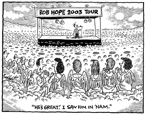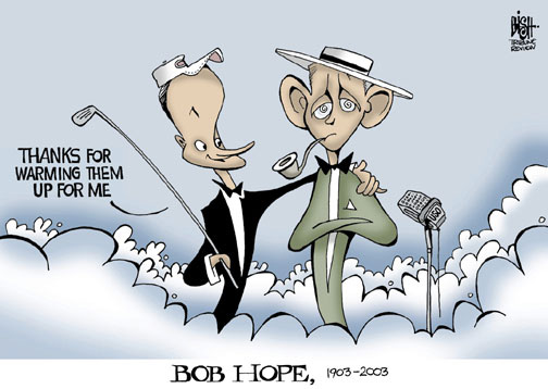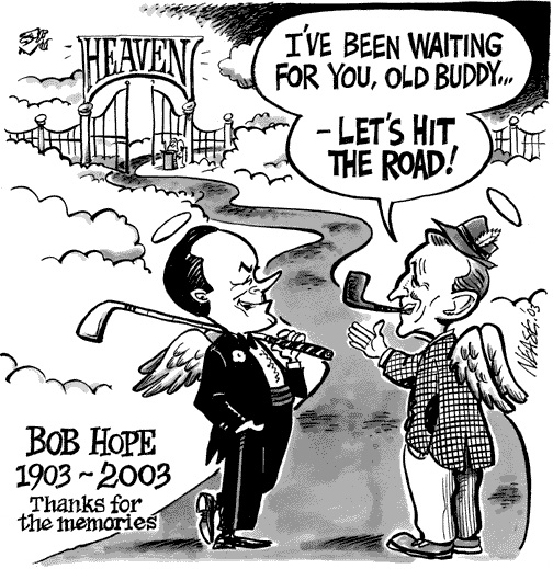 As happens so often, one of our web-site visitors has passed a collection of Bob Hope Memorial Cartoons on to us. Reviewing this material has brought the life work of Bob Hope into clear focus for me. It has also sharpened my appreciation for the cartoonists who give us such moving perspectives on life through their genius as presented through the various media.