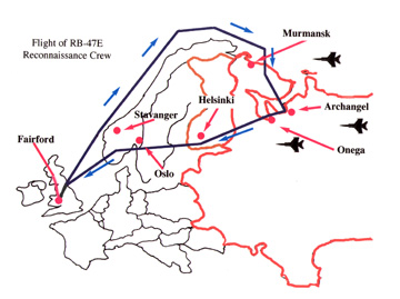 | On this particular TDY, my crew, Carl Holt, Co-pilot, and Vance Heavilin, Navigator, and myself, had been in England about two weeks, when on May 6 we launched a “feint” of seven RB-47’s toward the USSR’s “Northern Exposure.” Taking pictures of Spitsbergen Islands, Northwest of Norway, we were well above 75 degrees north latitude. Although we didn’t know it at the time, this “feint” was to set up our mission of the 8th of May. On the 8th of May, the three RB-47E crews for the mission were briefed separately and apart by two SAC Intel Colonels. Our particular mission was to penetrate Soviet airspace and take pictures of nine Soviet airfields to find out for General LeMay if the “new Migs” (MIG-17’s) were deployed to the area. We were also looking for deployed Bison Bombers. The other two aircraft were to proceed with us to a point about 100 miles north of Murmansk and then return to base. |