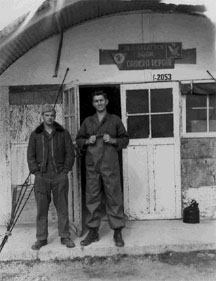 Standing at entrance of camera repair shop, Kadena AB, Okinawa. Both men were Photo/Gunners on RB-29s