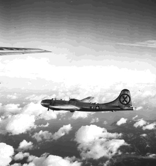 | The view-finder was a converted K-18 camera fitted with a ground glass on the focal plane (Where the film would normally be). I was to get the interval for proper overlap of the photos and also guide the pilot for proper aiming. We flew several training flights, developing methods (This had never been done before) with the tech rep assisting in training of the camera operations. Franks and I took turns riding the bomb-bay so that we were both qualified to operate the camera. |